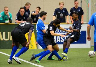 Kirchheims Can Aydinguelue (2.v.l.) gegen die Mannheimer Hamu Juvhel Tsoumou (li.), Talha Yazgan (3.v.l.) und Yannick Tewelde.