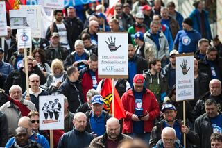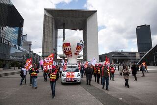 epa05249759 Demonstrators of the European Alstom staff gathering walk to the company headquarter at La Defense in Paris, France, 08 April 2016. The gathering takes place as Alstom-GE announced the reduction of 6500 jobs. EPA/ETIENNE LAURENT +++(c) dpa - Bildfunk+++