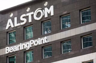 epa05249580 Demonstrators protest next to Alstom headquarter as a European Alstom staff gathering at La Defense in Paris, France, 08 April 2016. The gathering takes place as Alstom-GE announced the reduction of 6500 jobs. EPA/ETIENNE LAURENT +++(c) dpa - Bildfunk+++