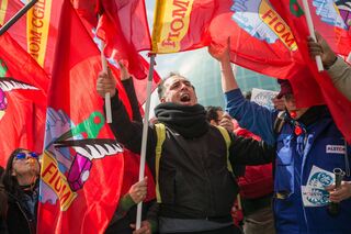 epa05249582 Demonstrators shout during a protest next to Alstom headquarter as a European Alstom staff gathering at La Defense in Paris, France, 08 April 2016. The gathering takes place as Alstom-GE announced the reduction of 6500 jobs. EPA/ETIENNE LAURENT +++(c) dpa - Bildfunk+++