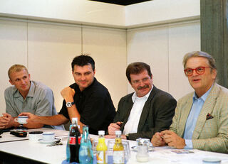 Ladenburg 16/06/00 Justus Frantz Preko. Erg. Bildtext: Vor seinem großen Auftritt bei "Klassik am Fluss" am Mittwoch, 21. Juni, auf der Ladenburger Neckarwiese nahm Justus Frantz gestern die Römerstadt persönlich in Augenschein. Nach einer Pressekonferenz (Bild links) folgte die Besichtigung des Veranstaltungsorts (rechtes Bild), wo Frantz (2.v.l.) von Bürgermeister Rolf Reble (2.v.r.) sowie den beiden Veranstaltern Dennis Gissel (links) und Michael Roth (rechts) über alle wichtigen Details informiert wurde.