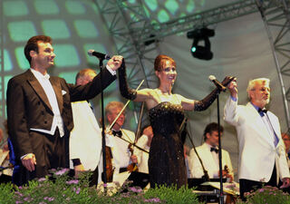 Ladenburg Klassik am Fluss 09/06/07 Bild: Schwetasch. Erg. Bildtext: Die Stars des "britischen Abends" bei "Klassik am Fluss": Sopranistin Anna Maria Kaufmann und ihr charismatischer Gesangspartner Franco Leon (l.) mit Moderator Ralph Philipp Ziegler.