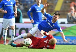 Darmstadts Jerome Gondorf (oben) und Münchens Sebastian Rode kämpfen um den Ball.