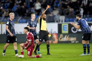 Jonah Besong (Schiedsrichter) zeigt Tim Sechelmann (SVWM, 4) die Gelb-Rote Karte.