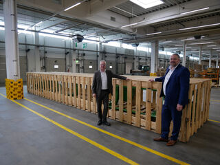 Dr. Wolfgang Voß (l.) und Martin Banditt im rund 45.000 Quadratmetern großen Ketscher Logistikzentrum von John Deere.