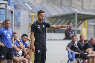 Dominik Glawogger (Cheftrainer, SV Waldhof Mannheim) gibt Anweisungen während dem Spiel.