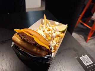 Gibt es eine Menüoption? Ja, Beilagen (Salat, Pommes, Süßkartoffel-Pommes) sind zum Burger günstiger.