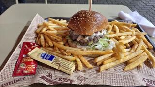 Ich entscheide mich für den Wagyu Trüffel Burger (34,90). Nicht nur aus preislichen Gründen. Denn zu den Toppings gehören neben dem edlen Fleisch auch Parmesan, Trüffel-Mayo, Salat, Tomate und eine hausgemachte Soße – eine sehr vielversprechende Kombi. Dazu kommt eine Portion gut gewürzter Pommes, die sehr großzügig ist, und dessen Rest ich mir einpacken lassen muss.
