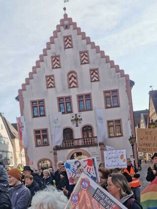 Es war ein buntes Bild, das sich am Samstag schon gegen 13.30 Uhr auf und rund um den Marktplatz zeigte. Viele Fahnen und Tansparente waren zu sehen, und mehr und mehr Menschen strömten auf den zentralen Platz der Stadt. Was deutlich wurde: Es war tatsächlich eine bunte Menschenmenge – ob Kolping-, Friedens- oder auch Deutschlandfahne – die gesellschaftliche Mitte war entschlossen, Flagge zu zeigen gegen Rechtsextremismus..