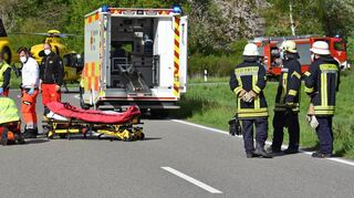 Creglingen/Craintal/Herbsthausen. Wie bereits in der Samstagsausgabe berichtet, ereigneten sich am Freitagnachmittag zwei schwere Unfälle kurz hintereinander – erst nahe Herbsthausen/Hollenbach und dann bei Craintal. Oberhalb des Creglinger Stadtteils stürzte ein aus Uffenheim stammender, 20-jähriger Motorradfahrer mit seiner KTM als er gegen 17.15 Uhr bergabwärts fuhr. In einer scharfen Linkskurve kam er nach rechts von der Fahrbahn ab, die an der Stelle wieder ansteigt. Der Kradfahrer schaffte es noch, mehrere Meter auf der Steigung im Grünstreifen zu fahren. Im Anschluss geriet er wieder in ein stärkeres Gefälle. Hier verlor er die Kontrolle über sein Krad und stürzte (Bild). Er zog sich Rückenverletzungen zu und wurde schließlich doch mit dem ADAC-Rettungshubschrauber „Christoph 65“ ins Krankenhaus geflogen. Gegen 16.30 Uhr krachte es dagegen schon auf der B 290 an der Abzweigung Hollenbach. Eine 77-jährige Fiat-Lenkerin wollte von Hollenbach kommend nach links auf die Bundesstraße in Richtung Herbsthausen abbiegen. Hierbei missachtete sie die Vorfahrt eines 62-jährigen Mercedes-Lenkers, der aus Bad Mergentheim kam. Beim Zusammenstoß wurden beide Fahrzeugführer schwer verletzt. Die Fiat-Fahrerin erlitt mehrere Frakturen, über die Verletzungen des Mercedes-Fahrers ist bislang nichts bekannt. Beide Beteiligten wurden stationär im Krankenhaus aufgenommen. Es entstand Sachschaden in Höhe von rund 15 000 Euro. Die Freiwillige Feuerwehr Niederstetten war mit drei Fahrzeugen und 14 Mann vor Ort zur Absicherung und anschließenden Reinigung der Unfallstelle. / sabix