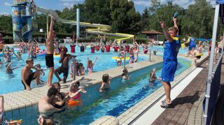 Bestenheid. Das Wertheimer Freibad in Bestenheid verwandelte sich am Samstag in eine Disko und Partymeile für Kleine und Große Wasserratten. Vier Stunden lang gastierte die Sparkassen-Pool-Party der Sparkasse Tauberfranken in und um die Becken. So gab es viele Spielaktionen zu Wasser und zu Land. Es gab im Wasser beispielsweise große Schwimmreifen, riesige aufblasbare Schwimmtiere zum Klettern, Laufbälle sowie Laufmatten über Wasser. An Land wurde unter anderem ein Torwandschießen angeboten. Insgesamt tummelten sich am Partytag rund 1800 Gäste im Bad. Bild: Birger-Daniel Grein