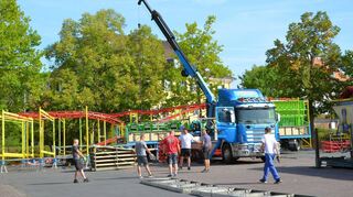 Buchen. Der Buchener Schützenmarkt öffnet am Samstag, 3. September, zum 193. Mal seine Tore. Bereits seit Dienstag sind die Aufbauarbeiten für das Festzelt und die Attraktionen in vollem Gange. Hierfür ist der Musterplatz schon seit Anfang der Woche für den Verkehr gesperrt. Gerade die Fahrgeschäfte benötigen einen mehrtägigen Vorlauf. Um die Sicherheit zu gewährleisten, müssen sie vor der Inbetriebnahme vom TÜV abgenommen werden. Wenn der Schützenmarkt am Sonntag, 11. September, zu Ende geht, wird es wieder einige Tage dauern bis die Schausteller ihre Attraktionen auf dem Musterplatz abgebaut haben und weiter ziehen können. Bild: Leon Manz