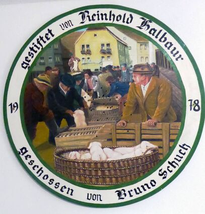 So zeigt die Scheibe von 1966 (gemalt von Helmut Pöpperl) einen zu jener Zeit bekannten Wanderschäfer, der die Stadt jährlich besuchte - und im Hintergrund die noch spärliche Bebauung der Hollerbacher Straße. Aus dem Jahr 1974 stammt die von Lisa Pfündel gemalte Königsscheibe, die die alte Schützenhalle zum Thema hat (an ihrer Stelle steht heute die Stadthalle).