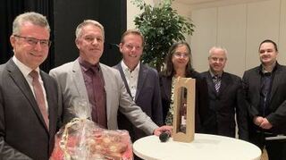 Gute Wünsche: Die Vorsitzenden aller im Kreistag vertretenen Fraktionen traten zu Beginn der Kreistagssitzung am Mittwoch in Buchen hervor und beglückwünschten Landrat Dr. Achim Brötel zu dessen Wahl zum Präsidenten des Deutschen Landkreistags (wir berichteten). „Es ist im Interesse aller Landkreise, dass du uns gut vertrittst. Viel Erfolg dabei“, sagte Dr. Norbert Rippberger und überreichte einen kleinen Geschenkkorb mit „stärkenden Nahrungsmitteln“. Brötel antwortete gewitzt: „Ich bis jetzt 22 Tage im Amt, und es macht immer noch Spaß.“