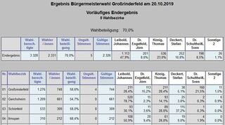 Die Entscheidung um den Chefsessel im Großrinderfelder Bürgermeisteramt muss nun im zweiten Wahlgang am Sonntag, 10. November, fallen. Dazu können weitere Kandidaten bis Mittwoch, 23. Oktober, ihre Bewerbung abgeben. Der Gemeindewahlausschuss wird danach tagen.