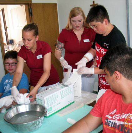 In der chirurgischen Praxis warteten Silvia Schwinn und Lisa Ballweg zunächst mit allgemeinen Informationen dazu auf, ehe sie wertvolle praktische Tipps zur Versorgung von Patienten vermittelten und die jungen Leute dabei auch aktiv werden ließen. Dabei ging es um Hilfsmaßnahmen bei Nasenbluten und Verbrennungen über das Anlegen von Verbänden bis hin zur Gipsschiene.