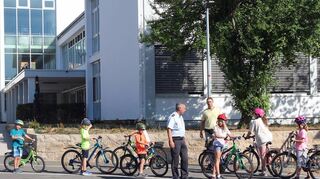 Gerhard Wolpert begrüßte zu Beginn im Eingangsbereich der Krautheimer Realschule die jungen Teilnehmerinnen und Teilnehmer der Aktion. Danach kontrollierten die beiden Polizeibeamten die Fahrräder der Kinder auf ihre Verkehrssicherheit und prüften dabei auch, ob der Fahrradhelm richtig passt. Selbstverständlich wurden von den beiden anwesenden Polizeibeamten den neugierigen Buben und Mädchen die Verkehrsregeln für ein sicheres Radfahren im Straßenverkehr vermittelt.