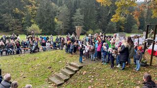 Die von den Kindern mitgebrachten Kuscheltiere wurden ebenso gesegnet wie die „echten“ Pferde, Hunde und Schafe. Einmal mehr umrahmte die Blaskapelle Watterbach-Breitenbuch den stimmungsvollen Gottesdienst inmitten der herbstlichen Natur, die zu schützen Pfarrer Prokschi den Menschen mit auf den Weg gab. Bild: Simone Schölch