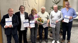 Tauberbischofsheim. Die traditionelle Weihnachtsfeier der Firma Brandel-Bau im festlich geschmückten betriebseigenen Verwaltungsgebäude bot den würdigen Rahmen für Ehrungen. Geschäftsführer Klaus-Dieter Schmitt führte kurz aus, dass trotz einer durchwachsenen Auftragslage dank des großen Einsatzes aller Mitarbeiter das Jahr hervorragend gemeistert werden konnte. Ehrungen wurden von den Geschäftsführern Klaus-Dieter Schmitt und Christian Reinhardt und dem Prokuristen Chris Baumann mit jeweils persönlichen Worten und Geschenken vorgenommen. Unser Bild zeigt (von links): Geschäftsführer Klaus-Dieter Schmitt (40 Jahre), Prokurist Chris Baumann (35 Jahre), Diane Hammerich (20 Jahre), Michael Albrecht (35 Jahre), Alexander Schirach (25 Jahre), Geschäftsführer Christian Reinhardt (25 Jahre). Auf dem Bild fehlt Jürgen Kaufmann jun. (10 Jahre). Bild: Brandel-Bau