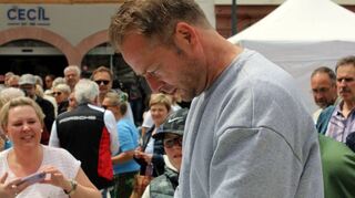 Von da an erreichten die Porsche-Klassiker fast im Minutentakt den Markplatz, wo sie von zahlreichen Fans begeistert begrüßt wurden. Als erster der angekündigten Prominenten traf Schauspieler Hinnerk Schönemann an der Meldestelle ein. Nach der Begrüßung durch Bürgermeisterin Anette Schmidt willigte er ein, einige Autogramme zu begeben, dabei wurde er stürmisch von den zahlreichen Schaulustigen begrüßt, Es machte ihm sichtlich Freude die zahlreichen Autogrammwünsche zu erfüllen. Während dieser Zeit füllte sich der Marktplatz rund um die Meldestelle auch mit Autogrammjägern.