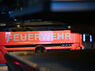 Feuerwehr untersucht Mähdrescher mit Drehleiter