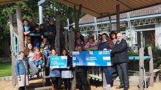 Walldürn. Über die Crowdfunding-Plattform „Viele schaffen mehr“ der Volksbank Franken sammelte der evangelische Kindergarten Walldürn Spenden für das Projekt „Beschattung des Außenspielgerätes & Sandkasten“. Das Vorhaben war erfolgreich: Mit 6145 Euro wurden sogar 122 Prozent des Finanzierungsziels erreicht. 5000 Euro waren angestrebt worden, die Volksbank Franken beteiligte sich mit einem Betrag von 2500 Euro. Im Außenbereich des Kindergartens übergab Bankdirektor Rainer Kehl dieser Tage den offiziellen Spendenscheck an die Verantwortlichen des Kindergartens. Leiterin Luise Rüße: „Die Kinder wird es freuen, an sonnigen und heißen Tagen im Schatten spielen und toben zu können.“ Bild: Volksbank