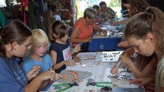 Werbach. Im Mosaikhof von Monika Thum fanden sich wieder viele Kinder ein, um auf eine große Fliese ein Mosaik zu legen. Nach dem Aussuchen einer Figur wurden die Fliesen mit der Zange kleingebrochen und zum bunten Mosaik gelegt. Mit der Fugenmasse werden nach dem Festkleben die Zwischenräume ausgefüllt und eine Kante rund um die Fliesenstücke geformt. Nach dem Trocknen wird alles zu einer steinharten Verbindung und mit dem Polieren kommen die bunten Fliesensteine wieder zum Vorschein und das Mosaik strahlt, wie die Kinder über ihre Werke. Bild: Thum