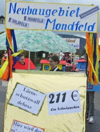 Aufgegriffen wurden aktuelle Themen aus dem Dorf und darüber hinaus. So widmete sich eine Gruppe wandelnder Wohnhäuser dem „Goldfeld“ Mondfeld, dem geplanten Neubaugebiet am See. Die Gruppe war überzeugt, bei 211 Euro pro Quadratmeter wiege man den Quadratmeter mit Gold auf. Eine weitere Gruppe nahm sich den Fachkräftemangel in Deutschland vor. Diesen finde man auch stark in der Politik. Große laufende Fußbälle hatten die Korruption bei der FIFA und der WM zum Thema.