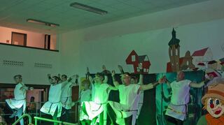 Aber egal ob aufwendige Verkleidung oder einfach kurzfristig improvisiert: Es feierten alle ausgelassen miteinander. Um die Stimmung ordentlich einzuheizen, hatten die Rouscheboutze fünf Männerballett-Gruppen engagiert. Den Anfang machten gleich zwei Premieren auf der Bühne der Waldsporthalle. Das Männerballett aus Grünsfeld nahm das Publikum mit ins alte Griechenland und erzählte mit dem Tanz „Dädalus – Erfinder und Architekt“ anschaulich die Geschichte von Ikarus und Dädalus. Gleiche Zeit, andere Gegend: Als römische Götter trug das Männerballett der Bischemer Kröten einen Kampf mit den Menschen aus.
