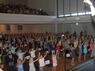 Die Zugfahrt nahm ihren Lauf und der erste größere Halt war in England mit „Amazing Graze“. Die Reise führte weiter nach Skandinavien und in Finnland war das Lied „Rati Riti Ralla“ zu hören. Eine unbekannte Melodie in einer noch fremderen Sprache, das brachte schon mal gute Stimmung unter den Zuhörern. Von Finnland fuhr der Zug quer durch Polen nach Rumänien, das Land, wo man das Lied „Oac Oac Diri Diri dam“ singt. Das Kinderlied erzählt von fröhlichen Fröschen, die selbst Musik machen und dabei das Küssen lernen. Die Fahrt nahm ihren Lauf in das Kriegsland Ukraine und es wurde etwas melancholisch im Pausenhof. Mit der „Ukrainischen Nationalhymne“ berührten die Kinder auch die Herzen vieler erwachsener Zuhörer. „Kat si stretan“ war der Song, der für Kroatien stand; immer wieder durch Show – und Tanzeinlagen begleitet, teilweise mit passenden Kostümen, so kam die Neugierde auf das nächste Stück auf. Die „kleine Nachtmusik“ von Mozart war Österreichs Beitrag bevor die Reise weiter nach Italien führte. Das Kinderlied „valzer de moscerino“ erzählt von einer Liebesbeziehung zwischen einer Biene und der Musik. Bei dem eher traurigen spanischen Lied von Alvaro Soler „Sofia“ sprang das spanische Feuer dann aber doch auf die jungen und älteren Fans über, kräftig klatschten und sangen sie mit, die Stimmung konnte nicht besser sein. Auf dem Bahnhof in Frankreich überraschte der Chor mit „Je ne parle pas francais“ mit abwechselnden deutschem und französischem Text und passenden Tänzen. Die Grundschüler hielt es nicht mehr auf den Bänken und stehend klatschten sie mit ihren Lehrerinnen im Takt.