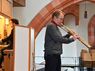 Bei einem einzigen Stück waren bis zu 14 verschiedene große und kleine, „normale“ und skurrile Instrumente im Einsatz. Selbst eine japanische Plastik-Vogel-Flöte in Blau und Gelb unterstrich optisch und akustisch das Thema des Abends: „Ein Eimer Klangfarbe“, das auch Pfarrerin Annegret Ade bei ihrer Begrüßung mit dem Wilhelm-Busch-Gedicht „Ein gutes Tier ist das Klavier“ aufgenommen hatte. Bei dem Marsch aus der Oper „Die Liebe zu den drei Orangen“ von Prokofjew kam das Heckelphon, eine Art Oboe in Baritonlage, klangstark zum Einsatz. Bemerkenswert und aussergewöhnlich erklang „Green, green grass of home“, bei dem Colin Friederich gleichzeitig Tenorblockflöte spielte und sang, ähnlich wie der in den 80er Jahren weltberühmte Jazzposaunist Albert Mangelsdorf. So hörte man dreistimmige Musik mit nur zwei sichtbaren Instrumenten. Bei diesem leisen Stück hatte Pianistin Eiko Yamada eine kurze Pause; ansonsten unterstützte sie die Flötenmusik mit einem tragfähigen, aber stets dezenten Klangfundament, das auch die manchmal kleinen und leisen Flöten immer gut zur Geltung kommen ließ.