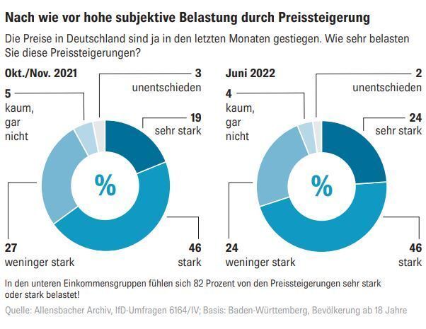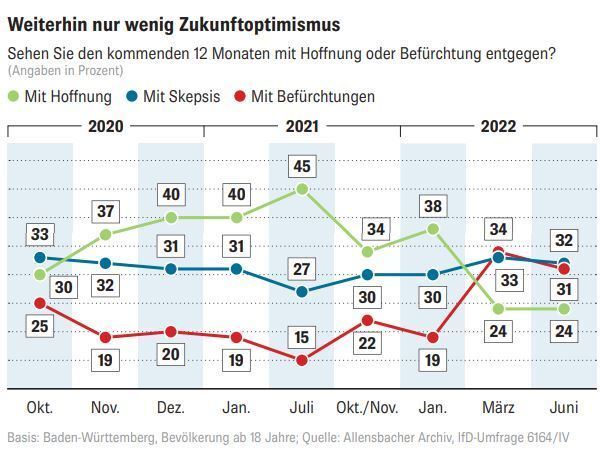 Insbesondere der Ukraine-Krieg und die Inflationssorgen beeinflussen die Stimmungslage der Bürgerinnen und Bürger in Baden-Württemberg massiv. Der Zukunftsoptimismus verharrt weiterhin auf einem historischen Tiefststand. Nach wie vor sieht nur knapp jeder vierte Baden-Württemberger den kommenden zwölf Monaten mit Hoffnungen entgegen, die große Mehrheit bleibt tief besorgt: Knapp jeder Dritte blickt mit ausgeprägten Befürchtungen auf die nächsten Monate, ebenso viele mit Skepsis. Damit liegt die Zuversicht in Baden-Württemberg unter dem Durchschnitt im Bundesgebiet: In einer zur gleichen Zeit durchgeführten bundesweiten Befragung waren 28 Prozent der Bevölkerung für die kommenden Monate zuversichtlich gestimmt.