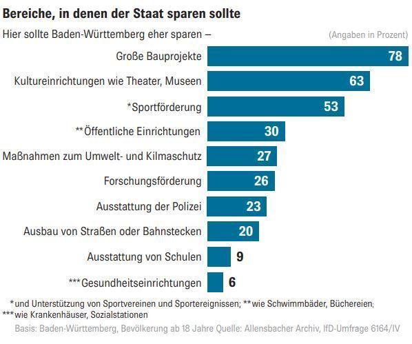 Umgekehrt gibt es nur wenige Bereiche, in denen die Bevölkerung Einsparpotenziale sieht. Am ehesten noch bei großen Bauvorhaben, bei kulturellen Einrichtungen sowie der Sportförderung. So meinen 78 Prozent, dass Baden-Württemberg bei großen Bauprojekten eher sparen sollte. 63 Prozent finden, dass auch bei Kultureinrichtungen wie Theater und Museen eher Geld gespart als ausgegeben werden sollte. Bereiche, in denen sich aus Sicht der überwältigenden Mehrheit der Bevölkerung Sparmaßnahmen verbieten, sind Gesundheitseinrichtungen und Schulen.