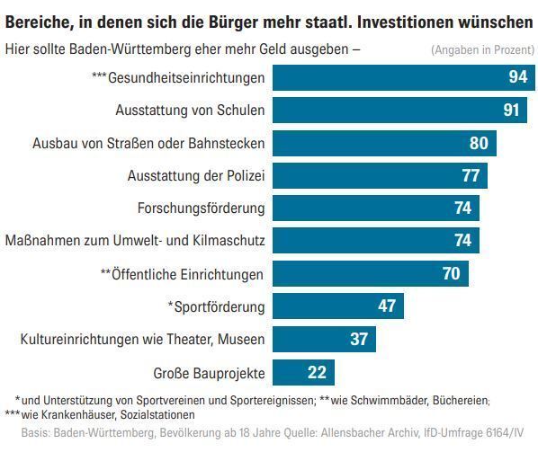 Im Gegenteil: Die große Mehrheit der Bevölkerung fordert von der baden-württembergischen Landesregierung in vielen Bereichen Mehrausgaben. Dies gilt insbesondere für Gesundheitseinrichtungen, Schulen, den Ausbau der Verkehrsinfrastruktur, die Ausstattung der Polizei, die Forschungsförderung, den Klimaschutz sowie für öffentliche Einrichtungen. Jeweils rund drei Viertel fordern zudem höhere Ausgaben für die Ausstattung der Polizei, für die Förderung von Forschungsvorhaben sowie für Maßnahmen zum Schutz von Klima und Umwelt.