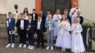 Röttingen. Pater Francois Tiando, Diakon Winfried Langlouis und sieben Ministranten holten die vierzehn Kinder am Pfarrheim ab und zogen unter musikalischer Begleitung der Stadtkapelle Röttingen in einem Festzug in die Pfarrkirche St. Kilian ein.