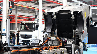 Die Fertigung des ersten eActros war im vergangenen Jahr im rheinland-pfälzischen Wörth angelaufen. Dieser Lkw für den sogenannten Verteilerverkehr hat je nach Ausführung drei oder vier Batteriepakete und eine Reichweite von bis zu 400 Kilometern.