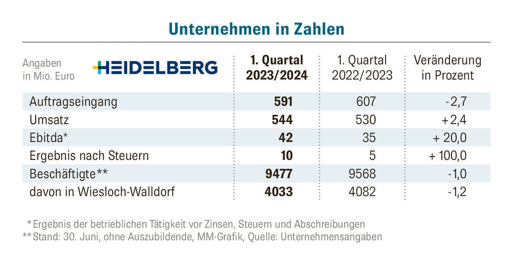 Heidelberg. Eine Erholung in Asien und Wachstum im Verpackungsdrucksegment haben dem Maschinenbauer Heidelberger Druckmaschinen einen guten Start ins neue Geschäftsjahr 2023/24 beschert. Der Umsatz legte von 530 auf 544 Millionen Euro zu, der Auftragseingang sank von 607 auf 591 Millionen Euro. Wichtig bei diesem Vergleich sei, die Wechselkurse zu berücksichtigen, erklärte Vorstandschef Ludwin Monz. Sie seien ungünstiger als vor einem Jahr. Daher sei der Auftragseingang etwa auf dem Niveau des Vorjahres. „Heidelberg ist gut ins neue Geschäftsjahr gestartet. Das erste Quartal verlief nach Plan“, sagte Monz in einer Telefonkonferenz.